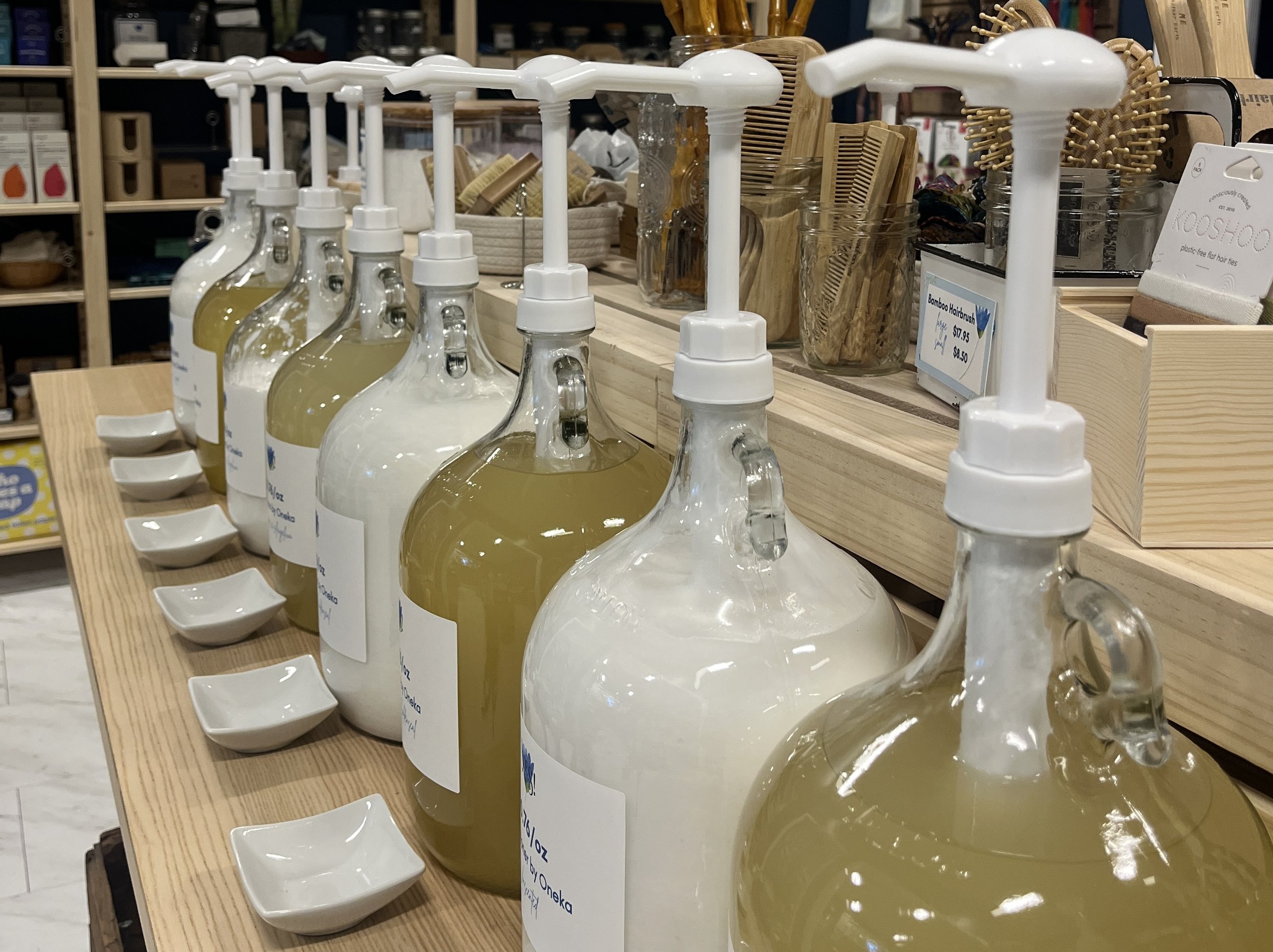 When choosing products, we look for ones that have natural ingredients, come from small suppliers, have minimal packaging, are cruelty-free, and that are as local as possible. Our bulk refill products come from the following companies: